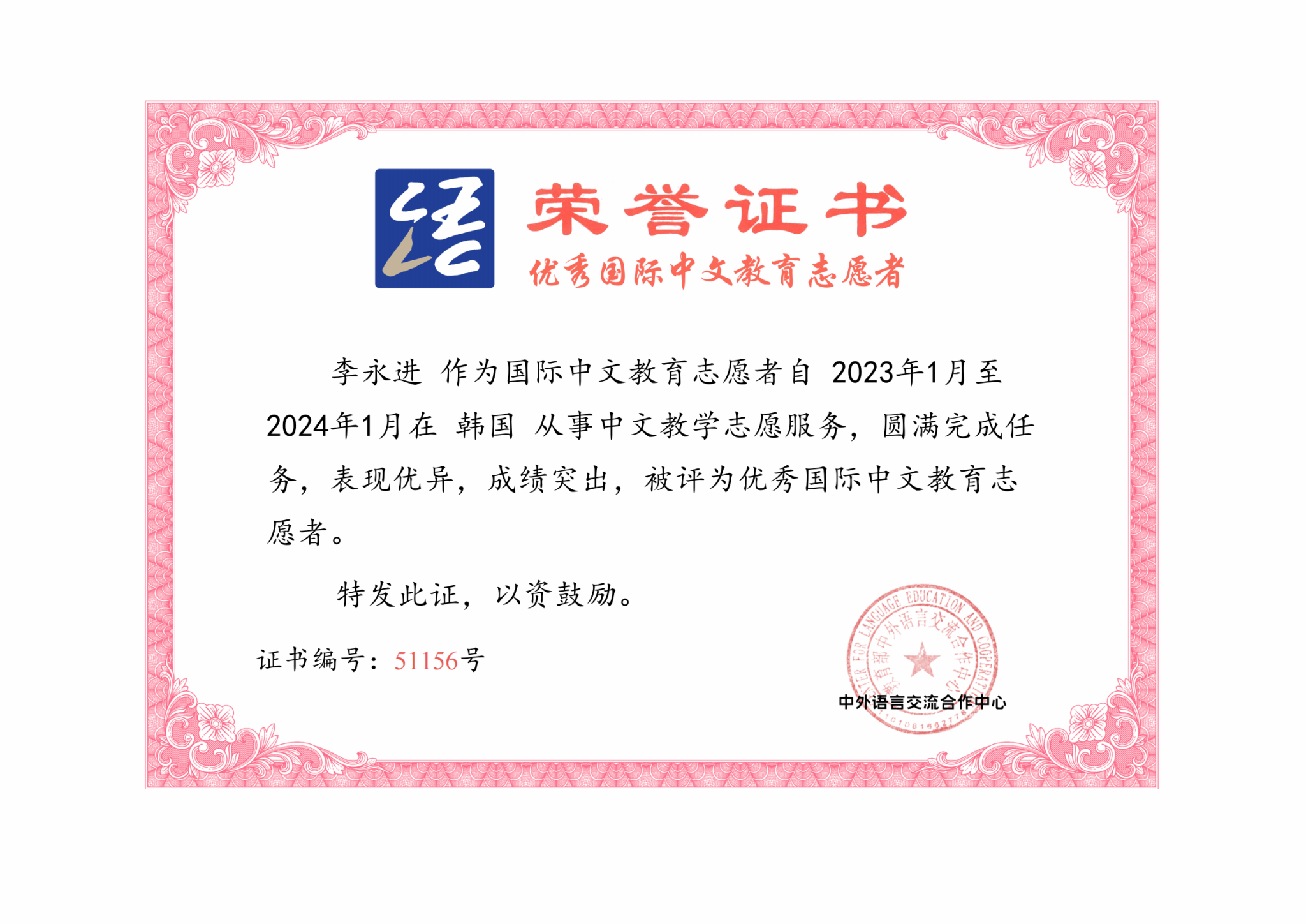 近日,教育部中外语言交流合作中心(以下简称“语合中心”)公布了2023年度赴韩国优秀国际中文教育志愿者名单,beat365国际商务学院教师李永进在150余名志愿者中以综合测评第二名的成绩荣获“优秀国际中文教育志愿者”称号。2022年初,学院接到语合中心关于推荐国际中文教育志愿者的通知,立即开展教师选派工作。李永进老师经层层遴选和考核,被选派赴韩国担任中文教师,开启中华语言文化传播之旅。在首尔三所高中担教的两年里,他以饱满的教学热情和出色的专业教学能力,...更多
