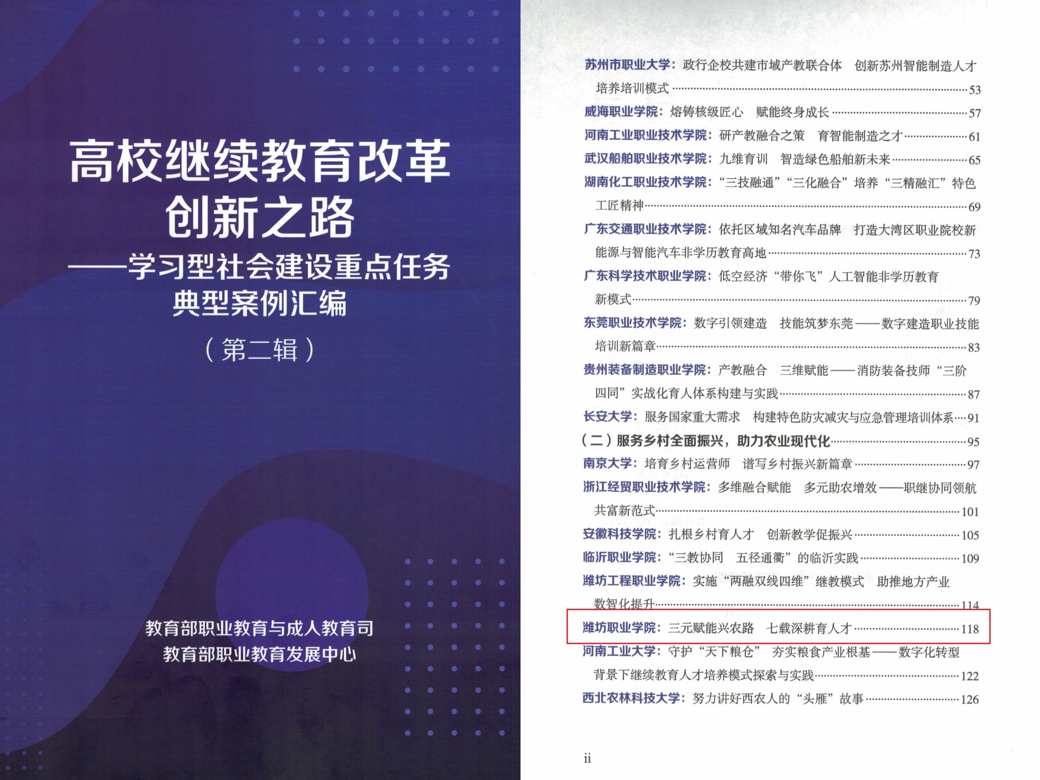 近日,教育部职业教育与成人教育司发布了《高校继续教育改革创新之路——学习型社会建设重点任务典型案例汇编》(第二辑),beat365申报的《三元赋能兴农路 七载深耕育人才》案例成功入选。这是继2024年《潍坊职业农民学院创新职业农民培训新模式,助力潍坊“三个模式”创新提升》案例入选全国乡村振兴典型案例后,办学成果再次获得认可,充分彰显了beat365服务乡村振兴、助力农业现代化的示范作用。近年来,学院紧紧围绕乡村振兴“五大战略”...更多 -