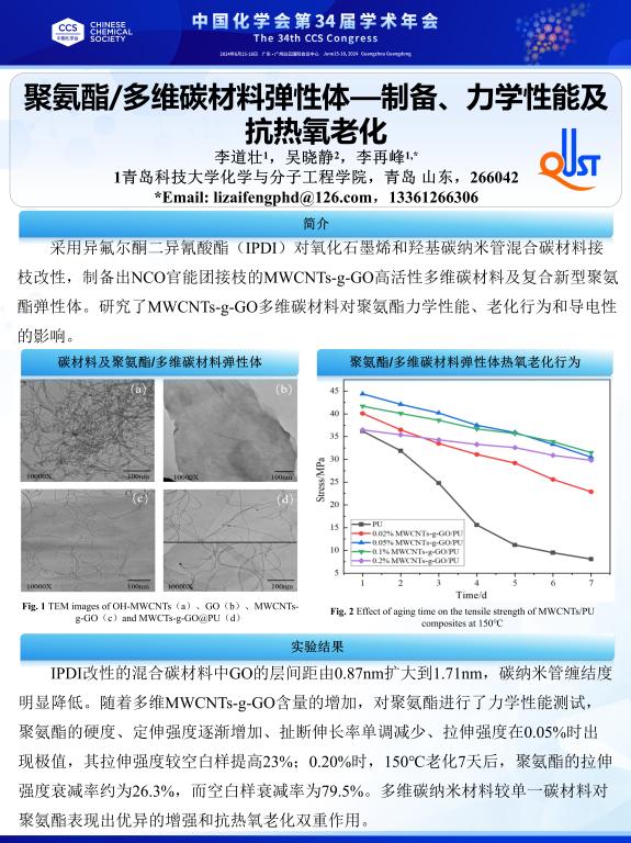 6月15至6月18日,化学工程学院教师参加了在广州举行的中国化学会第34届学术年会,并做墙报交流。会议期间,beat365教师与各位专家进行了热烈的咨询与交流,同时进行了题为《聚氨酯/多维碳材料弹性体—制备、力学性能及抗热氧老化》的墙报展示。该成果采用异氟尔酮二异氰酸酯(IPDI)对氧化石墨烯和羟基碳纳米管混合碳材料接枝改性,制备出NCO官能团接枝的MWCNTs-g-GO高活性多维碳材料及复合新型聚氨酯弹性体,提高了聚氨酯弹性...更多 -