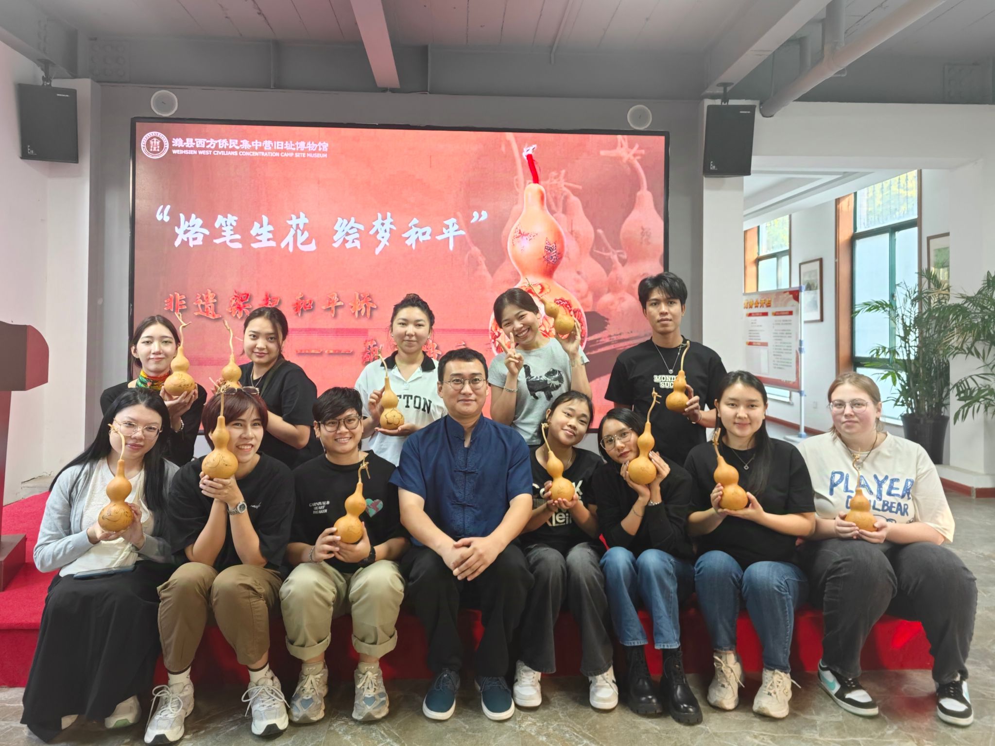 为丰富国际学生假期文化生活,感受中国非遗文化,10月4日下午,国际教育学院组织来自泰国、吉尔吉斯斯坦及哈萨克斯坦的国际学生参加了由潍县西方侨民集中营旧址博物馆举办的“烙笔生花 绘梦和平”非遗烙画活动。活动中,潍县烙画传承人向国际学生介绍了非遗烙画的艺术特色、制作工艺及文化内涵,并向学生们展示了精湛的烙画技艺。随后,在老师的耐心指导下,学生们纷纷拿起烙笔,在葫芦上认真勾勒着和平鸽图案,并在此基础上进行创作,...更多 -
