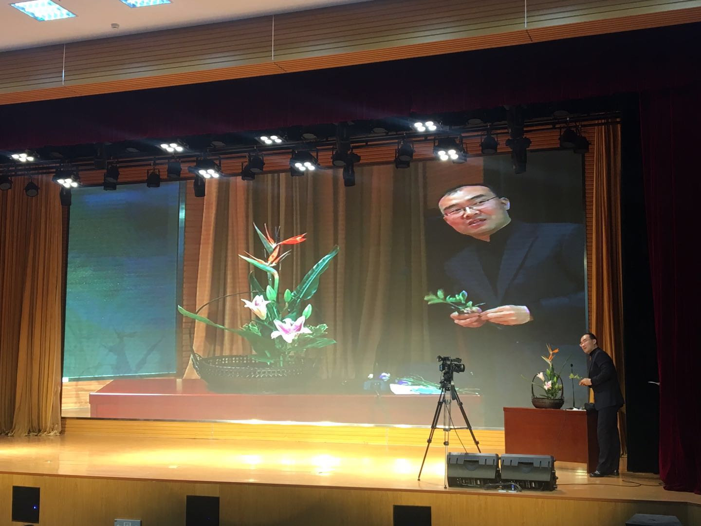 张二海老师从“什么是中国传统插花艺术”入手,向同学们介绍了我国传统插花艺术的历史渊源和传播发展。主讲人引经据典,将花艺与中华传统文化、经典诗词、审美情趣、传统美德和文化意识等结合在一起,通过展示花艺作品,阐述了中国传统花艺所传达出的思想内涵、道德标准和处世哲学;援引了屈原、陶渊明、苏轼、郑板桥、王子猷等文化名家及其作品,丰富了花艺内涵,展现了极高的文化素养。主讲人进行了现场插花演示,一件东方式花篮在其娴熟的手法下展现在了同学面前,其巧夺天工的技艺引得同学们赞叹不已。报告使同学们获得了多重的艺术享受,感受到了花艺之美、自然之美和文化之美,提高了自身的审美意趣。