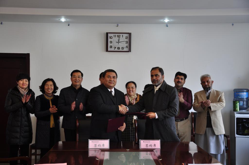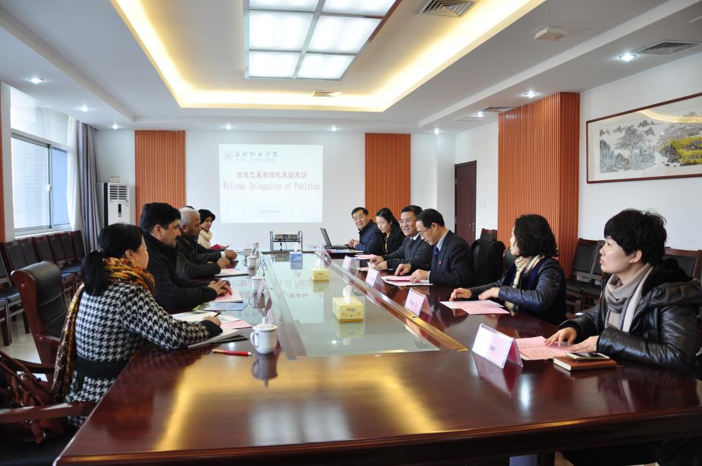 赵君堂主持座谈会。王家爱致词,对巴基斯坦代表团的来访表示热烈欢迎,全面介绍了潍坊市的历史、文化、教育等发展情况,以及学院的办学规模、专业设置、人才培养及国际交流与合作等情况,并提出“一带一路”建设及中巴经济走廊建设为两国互联互通、共同发展提供了契机,中巴经济合作项目建设需要更多会汉语懂技术的技能型人才,这将为两国开展教育交流与合作提供更大机遇。随后观看了beat365宣传片。巴基斯坦代表团的各位校长对学院的热情接待表示感谢,介绍了巴方学院的办学情况,并就与beat365合作开展汉语培训和职业技能培训具体合作事宜进行了洽谈交流,在共建汉语培训中心、留学生教育、师生交流等方面达成了共识并签署了合作协议。