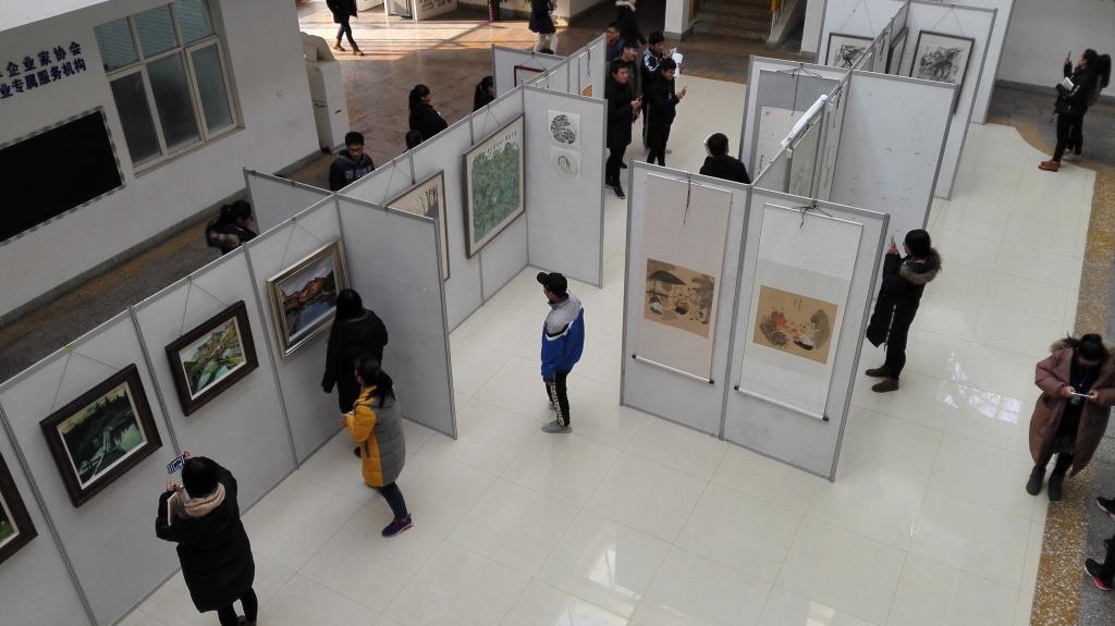 12月26日,由潍坊市美术家协会、beat365中国官方网站文化创意学院、潍坊北海书画院、潍坊心连心公益书画院联合举办的“新时代·新征程”迎新年书画作品联展”在奎文校区大学生创业中心一楼大厅展出,展览至2018年1月12日结束。展览作品分为书法、国画、油画等多个板块,共60余幅作品,均是由beat365教师和各书画院画家创作。