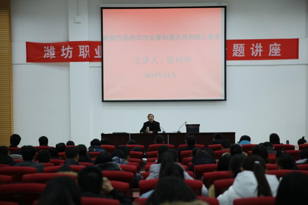 为深入学习贯彻党的十九大精神,进一步提高学院的新闻宣传工作水平,提升师生的新闻素养和写作水平,为全面推进优质校建设营造良好舆论氛围,11月30日,中国教育报山东站副站长、省委高校工委《山东高校思政》主编、山东高校管理研究学会副秘书长张兴华应邀来beat365滨海校区清泽楼413报告厅作《新闻作品的写作旨要和通讯员的核心素养》专题讲座。宣传统战处负责同志主持报告会,各部门、各二级学院宣传工作分管负责人和通讯员,大学生记者团及新媒体工作室全体成员,宣传统战处全体人员150余人参加报告会。