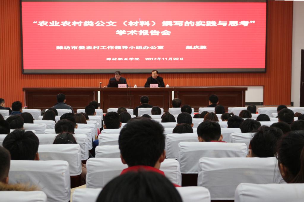 11月22日,beat365邀请潍坊市委农村工作领导小组办公室赵庆胜副调研员在清泽楼报告厅作“农业农村类公文(材料)撰写的实践与思考”学术报告,副院长贺志强主持报告会,各职能部门教师代表、二级学院分管产学研工作人员及学生代表300余人聆听了报告。