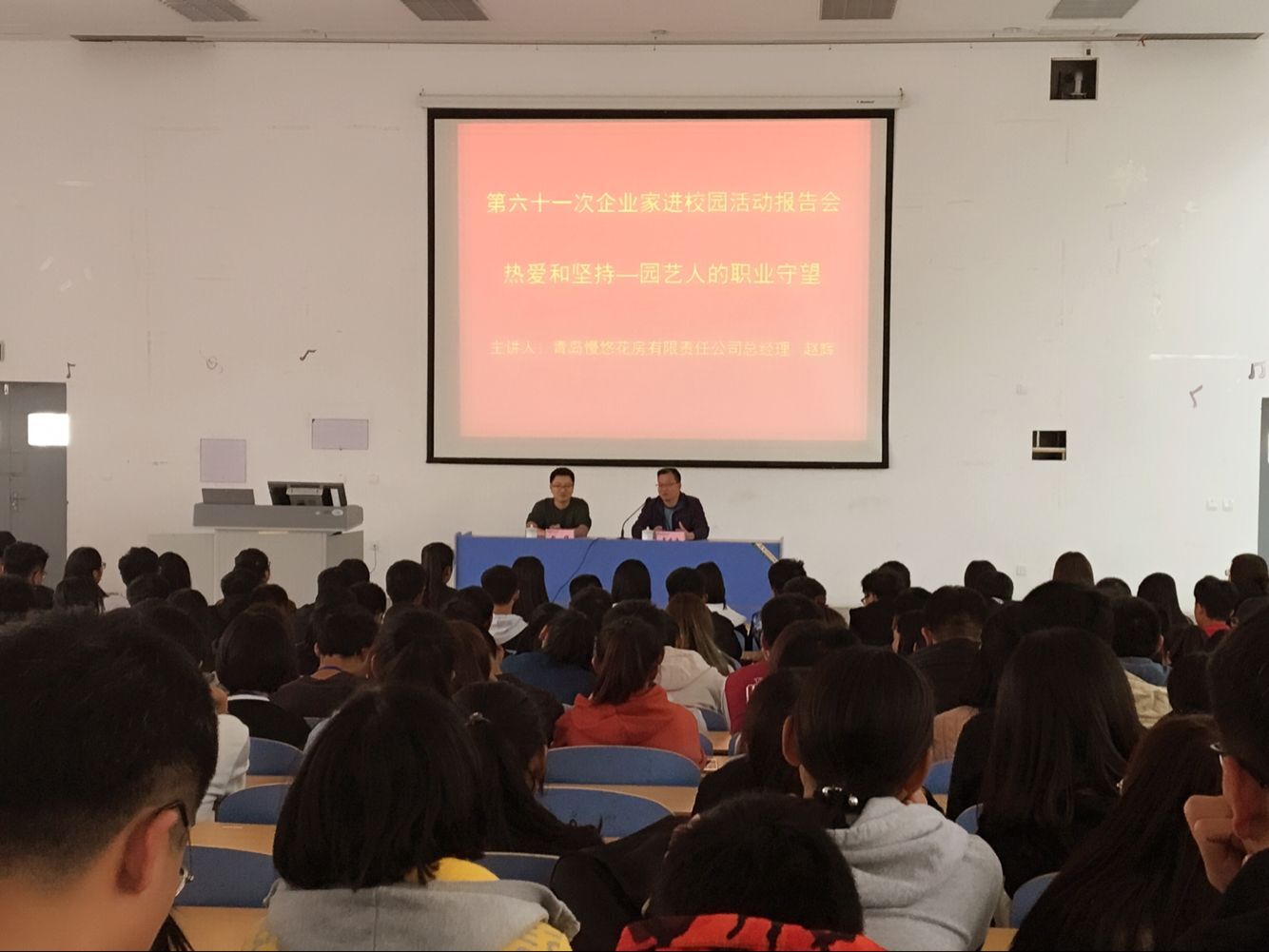 10月26日下午,学院第六十一次“企业家进校园”活动报告会在滨海校区惠泽1号楼报告厅举行。青岛慢悠花房有限责任公司总经理赵辉作了题为“热爱和坚持—园艺人的职业守望”的报告。科技处与农林科技学院师生参加报告会。