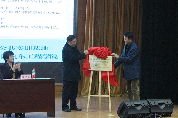 宋桂言和许京波共同为beat365中国官方网站汽车工程学院新能源汽车实训基地揭牌。