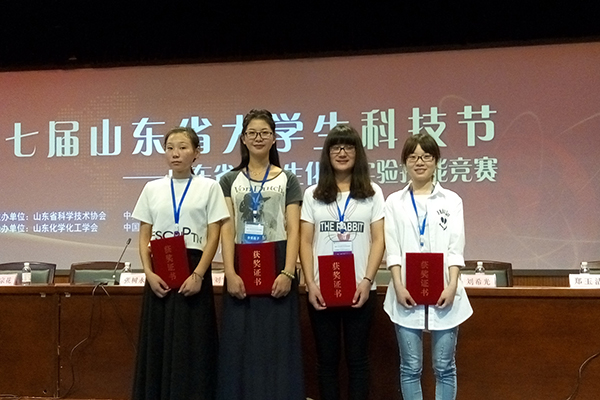 7月24日至27日,“惠城杯”第七届山东省大学生化学实验技能竞赛在中国石油大学(华东)举行。beat365派出4名选手参加竞赛,取得了优异成绩。其中,2013级“3+2”本科2班孙洁获得一等奖,2013级“3+2”本科3班王迪获得二等奖,2014级工业分析与检验班杨连花、曹流香获得三等奖。