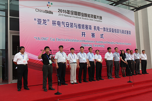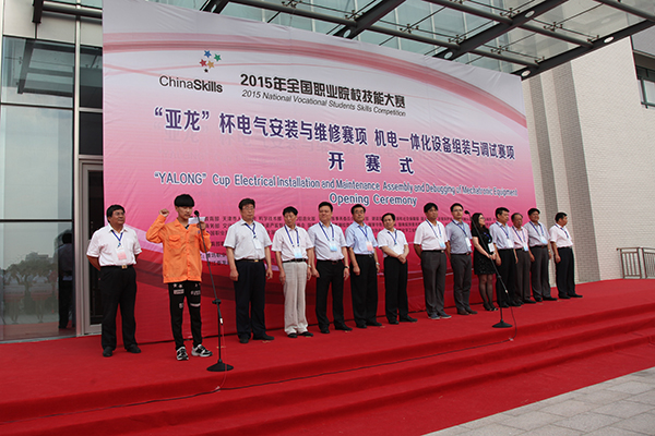 6月13日下午,2015年全国职业院校技能大赛“亚龙杯”电气安装与维修、机电一体化设备组装与调试赛项开赛式在学院滨海校区隆重举行。工信部教育与考试中心副主任周明,教育部职成教司办公室朱彬,山东省教育厅职教处调研员刘宝君、副处长赵丽,潍坊市政府党组成员、学院党委书记陈仁杰,潍坊市教育局局长徐友礼,浙江亚龙教育装备股份有限公司总经理陈传周,赛项顾问杨少光教授、曾祥富教授,潍坊市教育局党委委员、市招办书记李广敬,滨海开发区管委会副主任宋世伟,学院副院长贺志强出席,来自全国各地及韩国、越南、新加坡、印度尼西亚等国内外185支代表队370名参赛选手及指导教师、领队共计1000余人参加了开赛式。学院院长王家爱主持开赛式。
