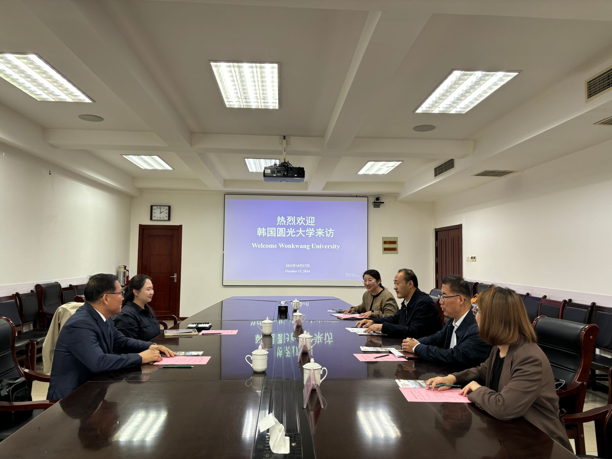 赵宏坤对客人的来访表示热烈欢迎,共同观看了学院宣传片,介绍了学院办学历史、发展现状及取得的主要成绩,就目前开展的国际交流项目做简要介绍,期待双方能在学生学历提升、教师研修、中外合作办学等方面开展合作。黄珍洙对学院的热情接待表示感谢并播放了圆光大学宣传片,介绍了圆光大学的办学规模、专业设置以及国际交流与合作等情况。随后,双方就关注的教师研修、学生联合培养及学历提升等项目进行了深入交流,初步达成合作意向 。