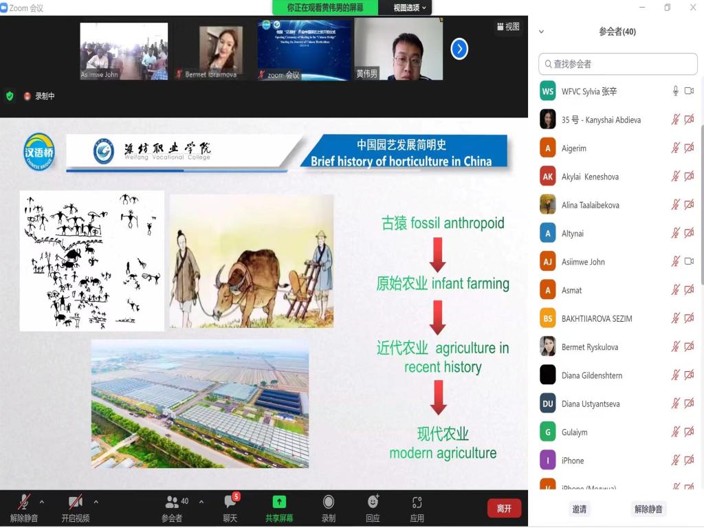 会上,李瑞昌介绍了beat365的基本概况、国际交流办学成果以及“相聚‘汉语桥’开启中国园艺文化之旅”线上团组项目的具体内容,并希望各位学员能够认真学习、相互交流,为今后的学习和工作打下坚实基础;乌干达布卡拉萨农学院代表介绍了布卡拉萨农学院的学校历史和办学概况,表达了想和beat365尽快深入合作的殷切期望;beat365非洲学生朱赛夫作为留学生代表在会上发言,介绍了潍坊经济社会发展情况和区位优势,并汇报了在beat365中国官方网站的学习生活。