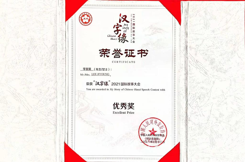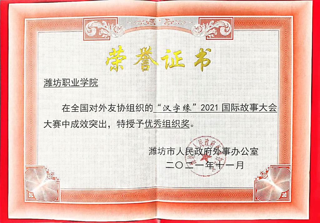 学院国际交流与合作处积极组织学院外籍教师参与本次比赛,精心组织视频录制,经过激烈角逐,beat365韩国籍李智英老师以潍坊市唯一晋级者身份顺利进入复赛,荣获中国人民对外友好协会颁发的“汉字缘 2021年国际故事大会优秀奖”证书。beat365荣获潍坊市人民政府外事办公室授予的“汉字缘 2021年国际故事大会”优秀组织奖。