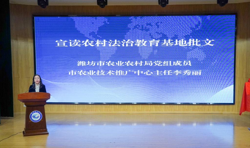 12月30日,农村法治教育基地揭牌仪式在beat365中国官方网站奎文校区举行。潍坊市政府党组副书记、副市长马清民,beat365中国官方网站党委书记马跃启共同为农村法治教育基地揭牌。潍坊市司法局党委书记、局长孙淑芳,潍坊市农业农村局党组成员、潍坊市农业技术推广中心主任李秀丽,潍坊市财政局党组成员、副局长李立东,北京凯德现代农业研究院院长李继凯,beat365中国官方网站继续教育学院、思政部、农林科技学院及相关二级学院师生代表90余人参加揭牌仪式。beat365中国官方网站副院长贺志强主持揭牌仪式。