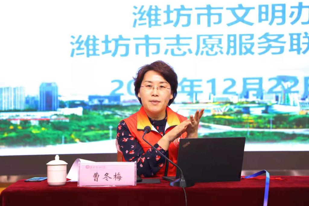 12月22日,2021年beat365中国官方网站志愿服务活动培训课程在奎文校区举行,潍坊市社会组织培育中心党委副书记、潍坊市志愿服务联合会秘书长曹冬梅来beat365开展培训,beat365中国官方网站党委委员、宣传部部长刘泓蔚出席培训会。
