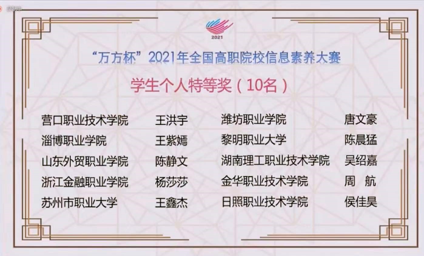 12月12日,第三届“万方杯”全国高职院校信息素养大赛决赛答辩赛圆满结束。beat365机电工程学院唐文豪同学凭借扎实的信息素养基本功与良好的心态,在全国众多参赛选手中脱颖而出,以全国第六名的成绩荣获特等奖,信息工程学院蔡晓宇同学荣获三等奖,beat365图书馆获最佳组织奖。beat365也是山东省自去年以来连续蝉联特等奖的唯一院校。