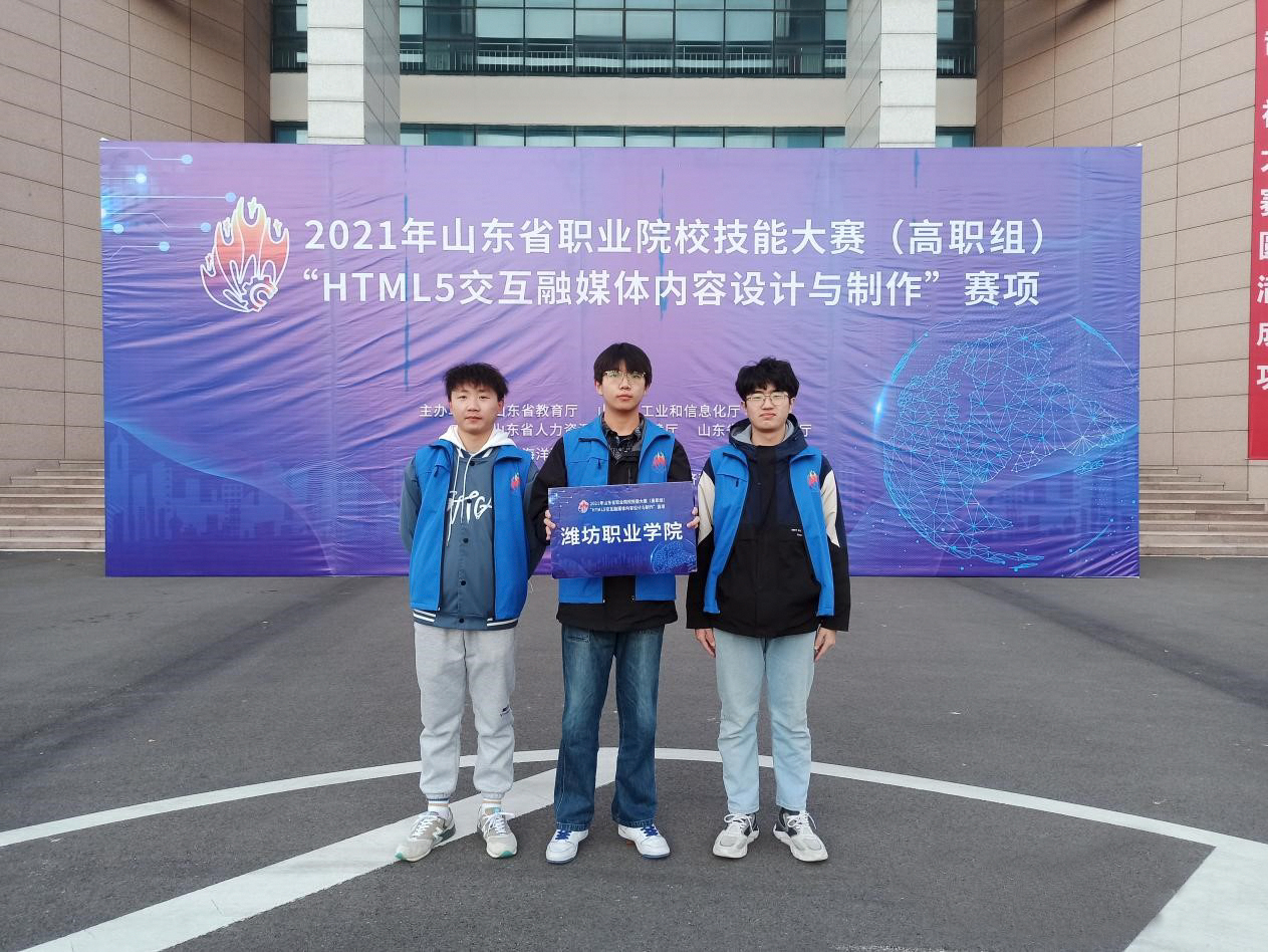 11月25日,2021年山东省职业院校技能大赛(高职组)“HTML5交互融媒体内容设计与制作”大赛在威海海洋职业学院举行,全省51所院校参加比赛。beat365信息工程学院焦玉涛、刘统良、张正帅3位同学在指导教师郑伟、冯燕妮的带领下,经过激烈角逐,获得山东省高职组二等奖。