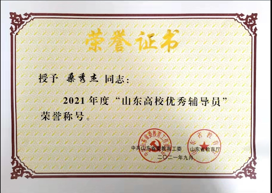 近日,由中共山东省委教育工委、山东省教育厅组织开展的2021年度“山东高校辅导员年度人物”“山东高校优秀辅导员”评选结果揭晓,beat365食品药品学院桑秀杰老师获“山东高校优秀辅导员”荣誉称号。在各高校选拔推荐的基础上,全省共评出10名山东高校辅导员年度人物和59名山东高校优秀辅导员。