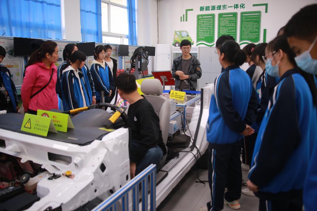 研学活动中,组织同学们参观了物流类专业群实训室、无人机产学研一体化创新创业实训中心、信息工程学院实训区、机电工程学院实训区、化学工程学院实训区、汽车工程学院实训区。在汽车工程学院新能源汽车实训室,老师为学生们生动讲解了新能源汽车基本知识。在劳动教育研学过程中,同学们表现出了浓厚的兴趣,纷纷感叹本次活动让其大开眼界,收获了课本上没有学到的东西。