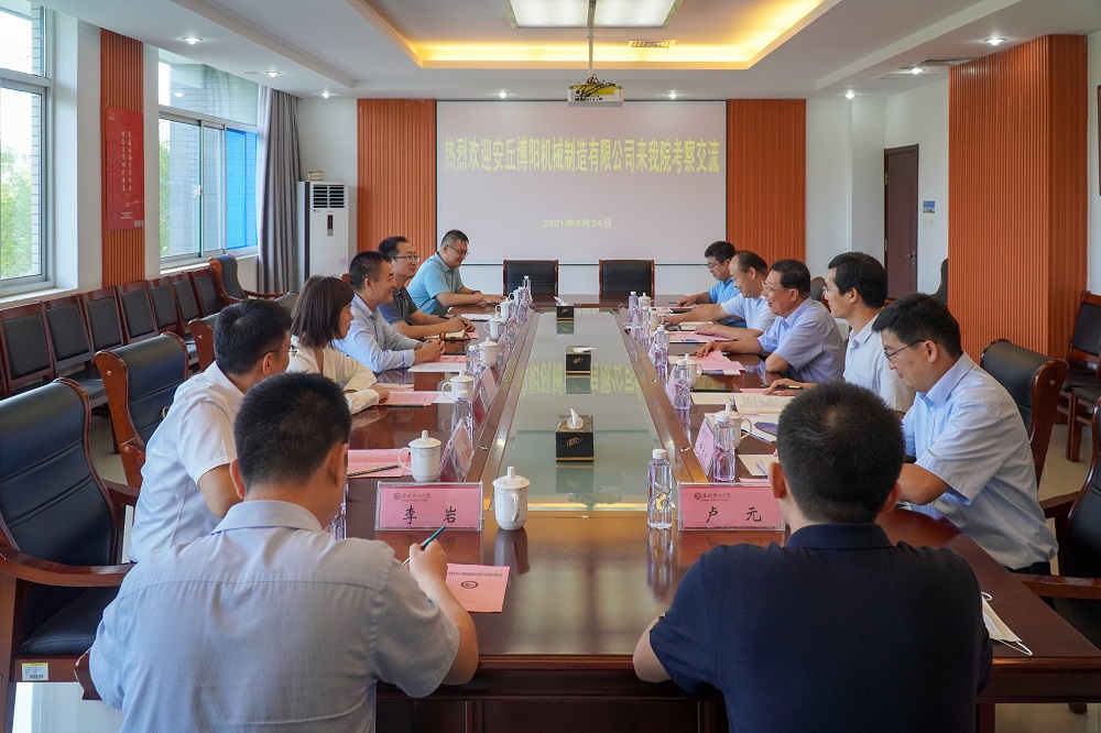 9月24日上午,安丘博阳机械制造有限公司总经理闫吉祥一行4人在共青团潍坊市委副书记张宝军、于涛陪同下,来beat365考察交流。学院党委副书记、副院长桑福岭陪同考察交流。团委学生工作处、科技处、机电工程学院、信息工程学院负责同志参加座谈交流。