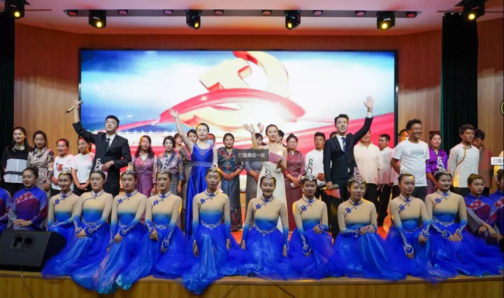 藏族文化有着悠久的历史渊源,藏族人民热情豪放、淳朴好客。培训班学员索朗独唱《青海湖》,歌声粗犷豪放,唱出了大美西藏的盛景;格桑玉珍一曲《幸福藏家人》,歌声圆润高亢,带着泥土、带着露珠,有情怀、有温度,深情咏唱幸福生活,咏唱着对党感恩、坚决跟党走的决心信心。次吉、格桑、索朗、巴久等学员《欢乐的锅庄》,大家身穿盛装,踏着音乐尽情舞蹈,气氛感染着2021级同学们,现场不时响起了连绵不断的掌声。文化创意学院精选的《谁不说俺家乡好》《额尔古纳河》《阳光路上》也获得了观众的热烈掌声。学生张璐、华丽红、李玉青、王树佳朗诵《党旗下》,回顾了建党百年风风雨雨,歌颂了中国共产党勇于改革、不断创新、引领中国走上富强民主之路的丰功伟绩。