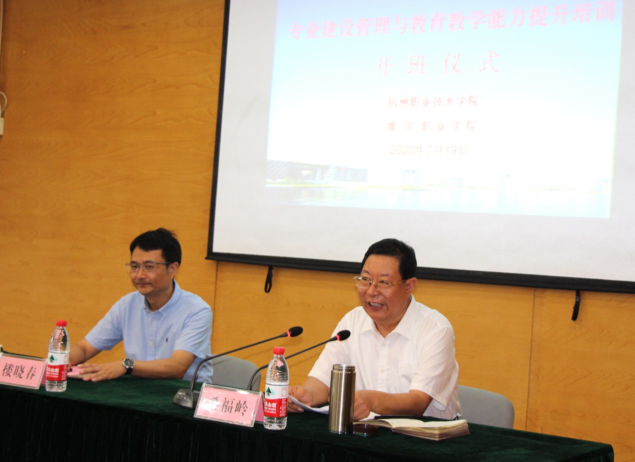 7月19日上午,学校2021年专业建设管理与教学能力提升培训班在杭州职业技术学院举行开班式。学校党委副书记、副校长桑福岭,学校领导赵君堂,副校长刘德强,党委委员、办公室(统战部)主任(部长)任培华以及学校有关部门的管理干部、专业(群)负责人、教学团队骨干成员和高水平骨干教师培育对象等46人参加开班式,会议由杭州职业技术学院继续教育学院院长主持。