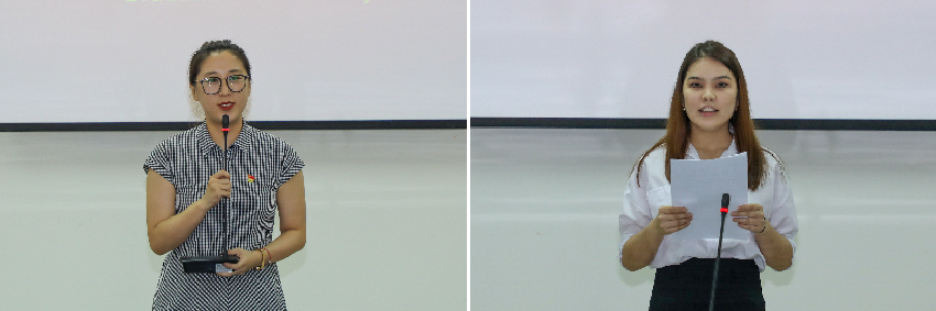 教师代表国际贸易专业教师安敏和汉语国际教育教师秦佳慧深情回顾了留学生教学中的艰辛历程和幸福点滴以及课堂上、生活中的美好时刻,并向全体留学生表达了师长们的殷切期望和真诚祝福。