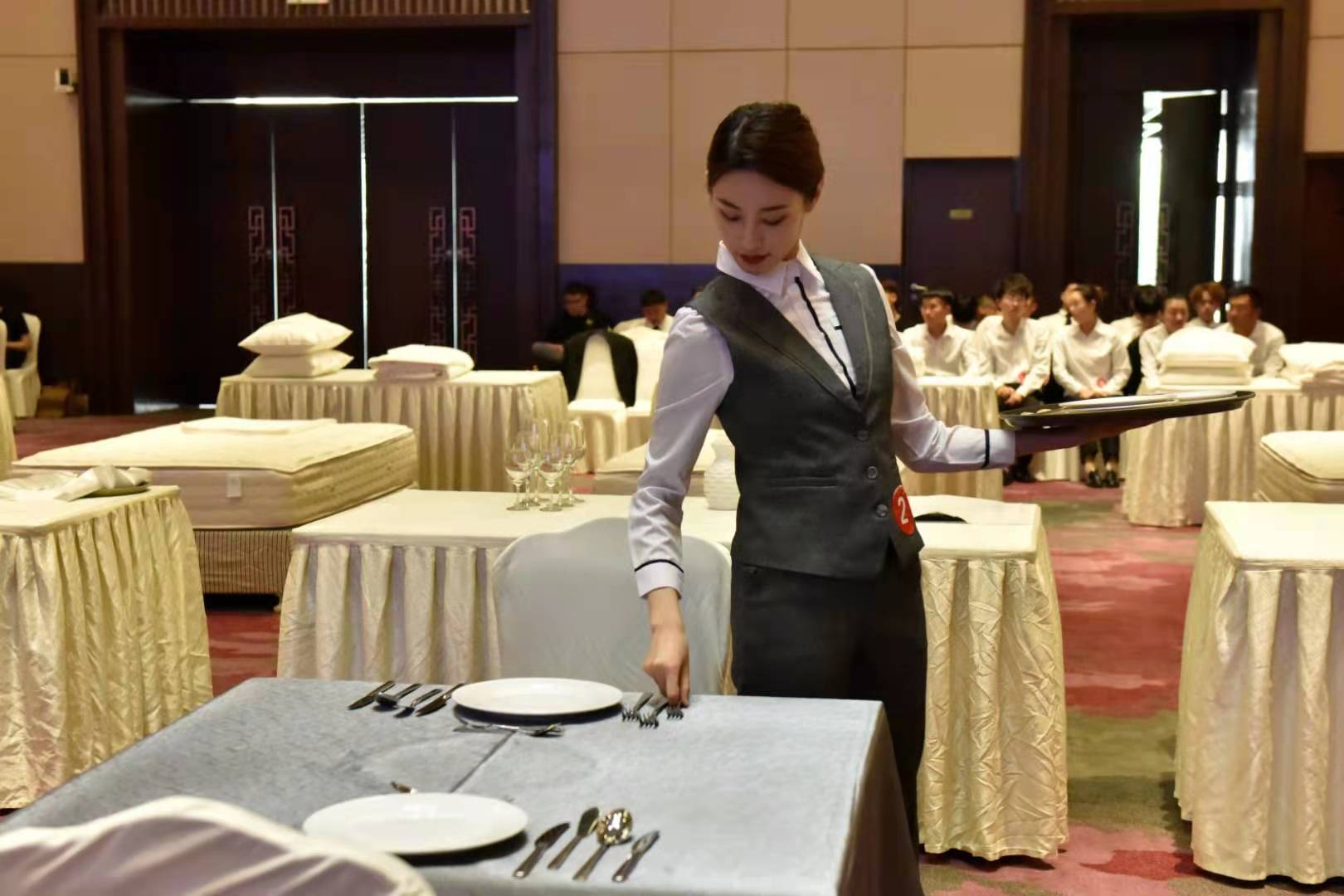 本次酒店服务技能赛项决赛共设中餐宴会摆台、西餐零点摆台、中式铺床三个项目,潍坊蓝海大饭店餐饮部、客房部等3个部门的主管和学院旅游管理专业3位骨干教师担任决赛评委。比赛中,18名同学分组依次亮相展示技能,他们操作到位、技术娴熟,动作优雅利索、仪态落落大方,使得紧张的比赛充满艺术的美感,展现了我校学生良好的精神风貌和技能水平。比赛项目结束后,旅游管理专业学生进行了“百人餐巾折花”集体展示,在指导老师的口令指挥下,同学们将手中的一方餐巾依次变幻出15种动植物、物品造型,动作整齐划一、操作迅速到位,令人拍手叫绝,展现了同学们扎实的专业基本功。