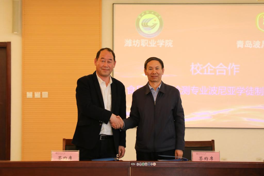 李瑞昌和段中航分别致辞。李瑞昌对青岛波尼亚食品有限公司多年来的支持表示感谢,介绍了学校近年来的发展、办学和突出成就等情况,他指出,中国特色现代学徒制是当前职业教育发展的趋势,希望双方积极探索校企协同育人机制、共同培养高素质技术技能型人才,促进学生的成长成才。段中航介绍了青岛波尼亚食品有限公司基本情况、企业文化、公司产品等,并表达了对本次合作的期望和祝愿。李瑞昌与段中航共同签署了beat365中国官方网站-青岛波尼亚食品有限公司食品营养与检测专业校企共建现代学徒制合作协议。