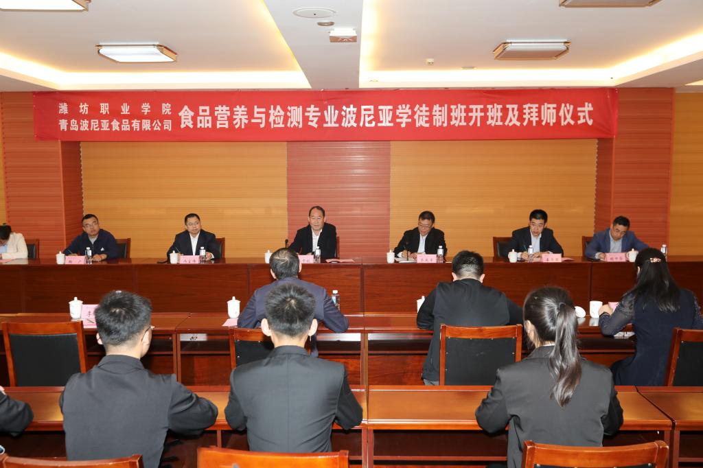 4月15日,学校与青岛波尼亚食品有限公司校企合作项目食品营养与检测专业波尼亚学徒制班签约及拜师仪式在滨海校区清泽楼312举行。学校副校长李瑞昌、青岛波尼亚食品有限公司运营副总经理段中航出席仪式,教务处、科技处相关同志、波尼亚公司项目负责人、食品药品学院党总支书记、教师代表和学徒制班全体师徒参加了仪式。