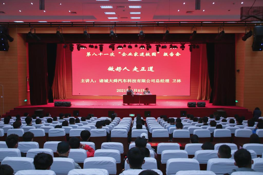 4月8日下午,学校第八十一次企业家进校园活动报告会在滨海校区图书馆报告厅举行。学校服务企业诸城大舜汽车科技有限公司总经理卫林作了题为“做好人、走正道”的报告。汽车工程学院院长杜洪香出席并主持报告会,科技处(产学研合作中心)、汽车工程学院、机电工程学院负责人、师生代表240余人参加了报告会。