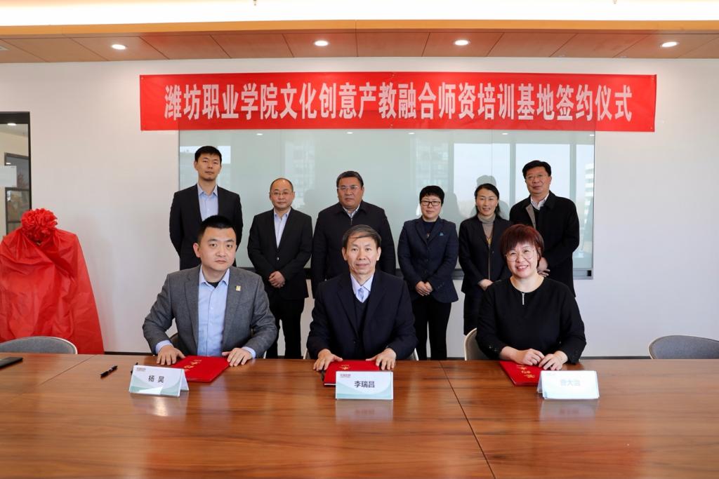 王家爱、刘建新、吴垠一起为文化创意产教融合师资培训基地揭牌;李瑞昌、杨昊、曹大治共同签署了合作协议。李瑞昌介绍了学院发展的基本情况,大家共同观看了学院宣传片;刘建新介绍了完美世界教育的基本情况和校企合作理念。大家一致认为本次合作将以“三教”改革为抓手,三方根据各自发展需求,发挥各自资源优势、进行“三教改革”、产教融合为主导的合作项目建设。同时对标国际标准开展围绕“教师、教材、教法”的师资培训项目,实现互惠共赢。