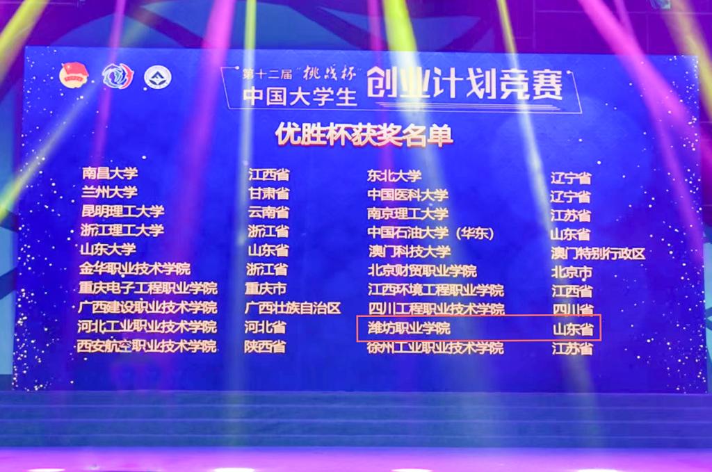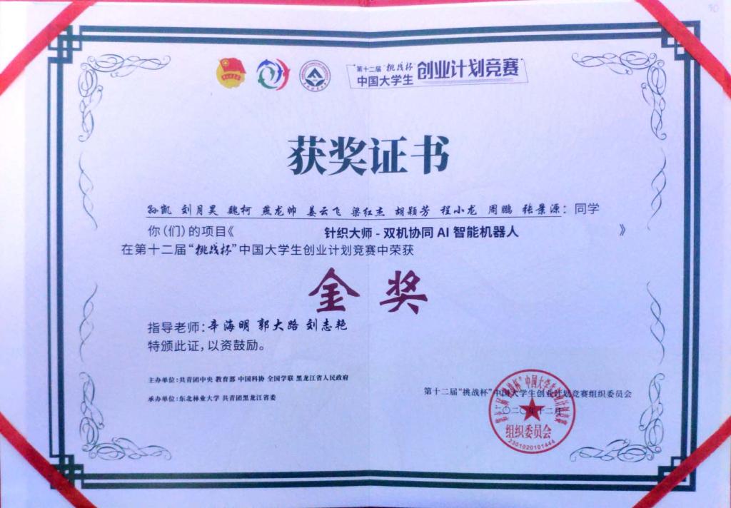 12月9日,第十二届“挑战杯”中国大学生创业计划竞赛全国决赛在东北林业大学落下帷幕,beat365孙凯等同学的“针织大师-双机协同AI智能机器人”项目荣获金奖,孟娇等同学的“大自然的化妆师”项目荣获银奖。学院同时获得“挑战杯”全国优胜杯,全国仅10所高职院校获此殊荣,是二十多年来山东省唯一获得“挑战杯”中国大学生创业计划竞赛金奖的高职学校。辛海明、郭大路等老师荣获全国优秀指导老师奖。