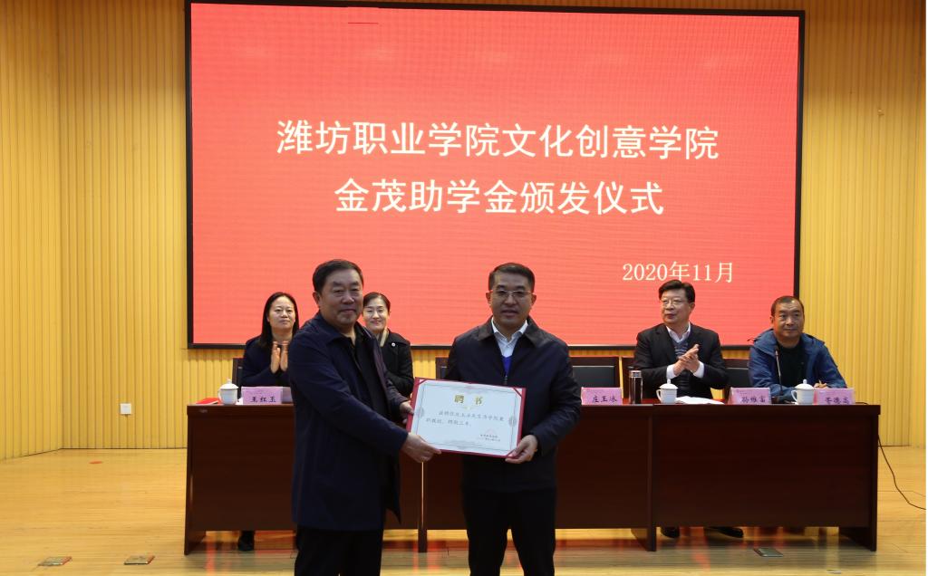 11月19日上午,学院在奎文校区创业中心报告厅举行“金茂助学金”颁发仪式。学院党委副书记宋桂言出席,潍坊金茂国际大酒店董事长庄玉冰、副总经理王迎春参加,文化创意学院相关负责同志出席颁发仪式。此次金茂助学金总额3万元,为15名成绩优异、生活困难的同学提供助学支持。