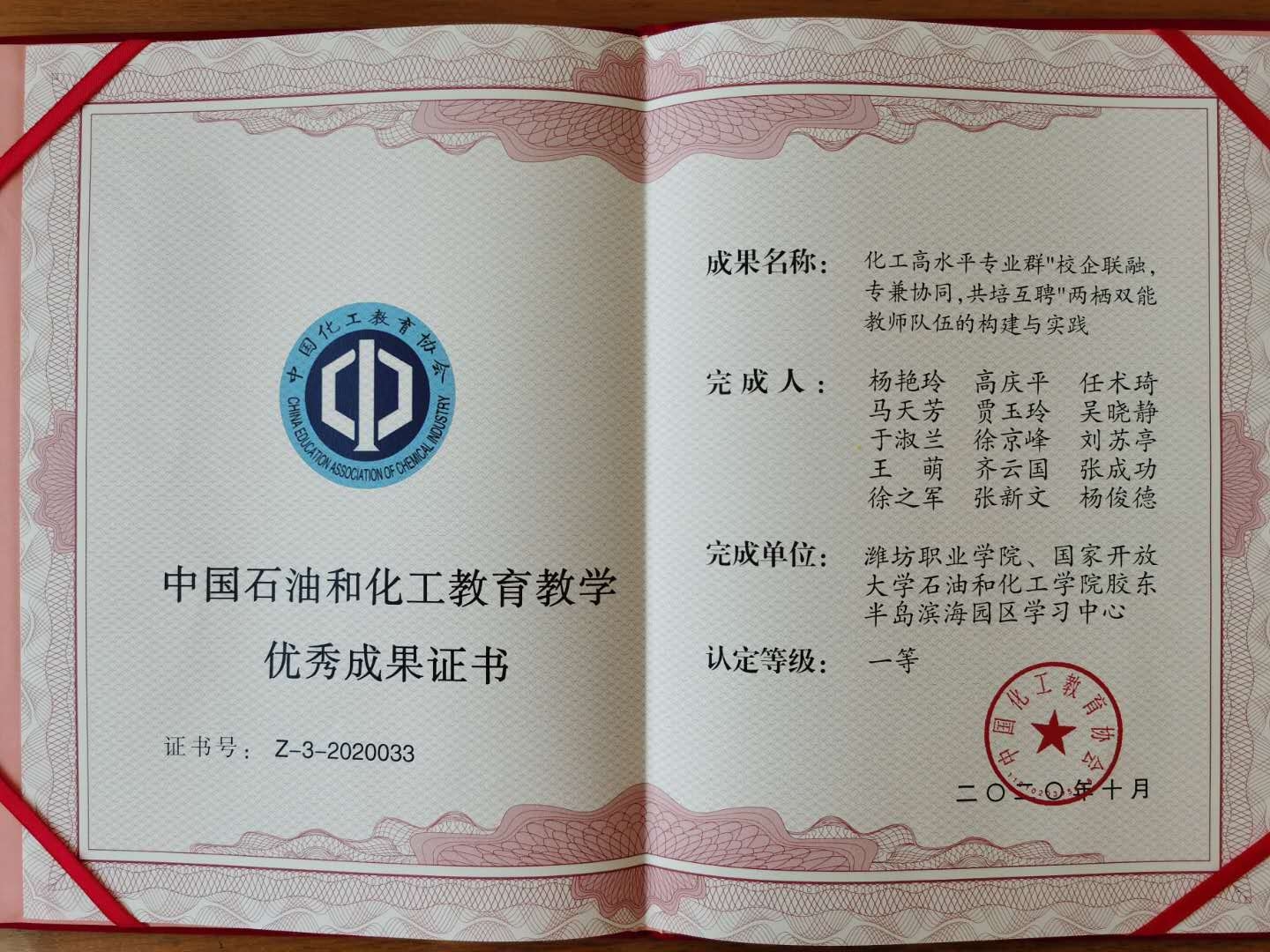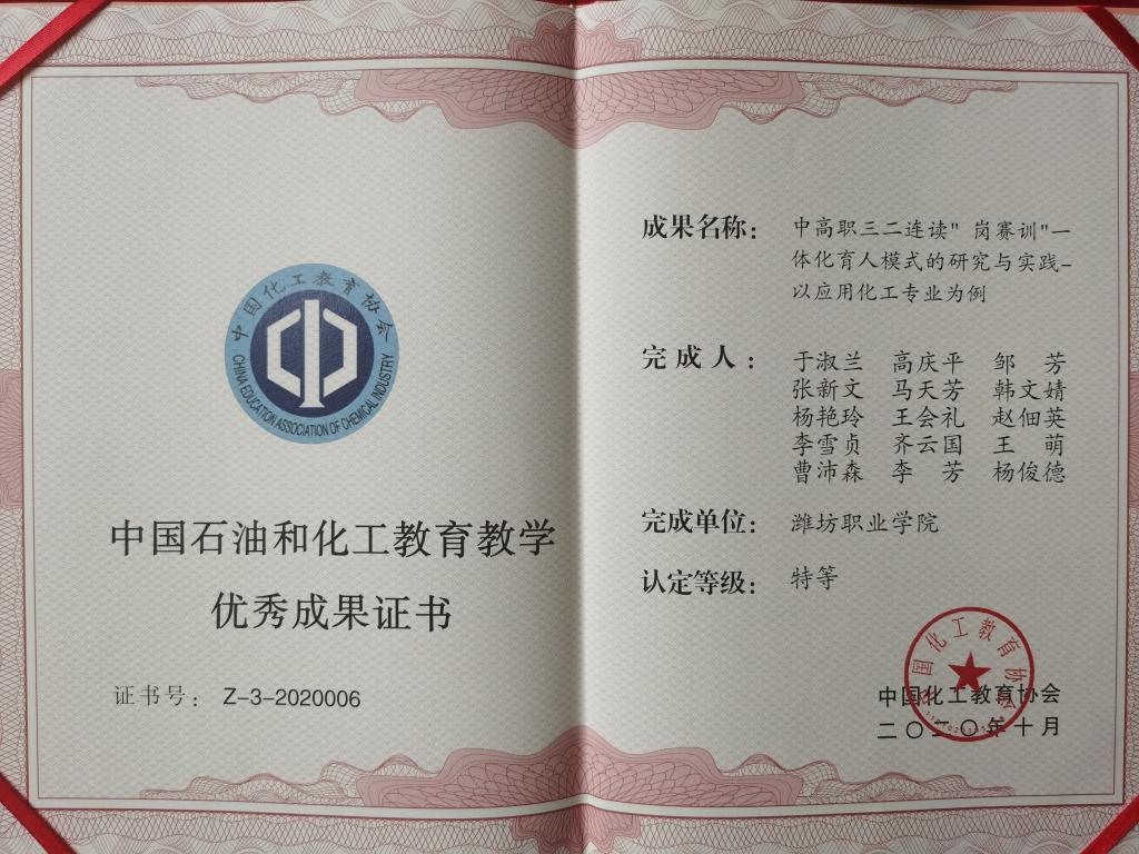 中国化工教育年会宣读了第五届中国石油和化工教育教学成果的认定结果,并向优秀成果获奖者代表颁发了荣誉证书。中国石油和化工教育教学成果每4年评定一次,本届参评成果400余件,按不超过申报总数的5%、15%、30%比例评选出优秀本科教学成果66项、论文31篇,优秀职教教学成果88项、论文39篇,其中特等奖仅16项(本科7项、高职9项)。beat365喜获优秀教学成果4项,其中山东省教育教学于淑兰名师工作室核心成员主研的《中高职三二连读“岗赛训”一体化育人模式研究与实践》、《化工高水平专业群“校企联融,专兼协同,共培互聘”两栖双能教师队伍的构建与实践》,《“双元四段,精准育人”化工现代学徒制人才培养模式构建与实践》依次荣获特等奖、一等奖、二等奖。