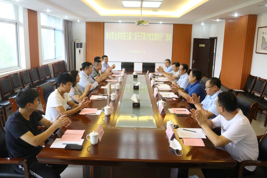 8月21日,学院在滨海校区举办“百千万英才校友潍坊行”活动,学院领导赵君堂出席会议,7名高层次英才校友代表、beat365有关行业专家学者代表参加会议,会议由招生就业处同志主持。