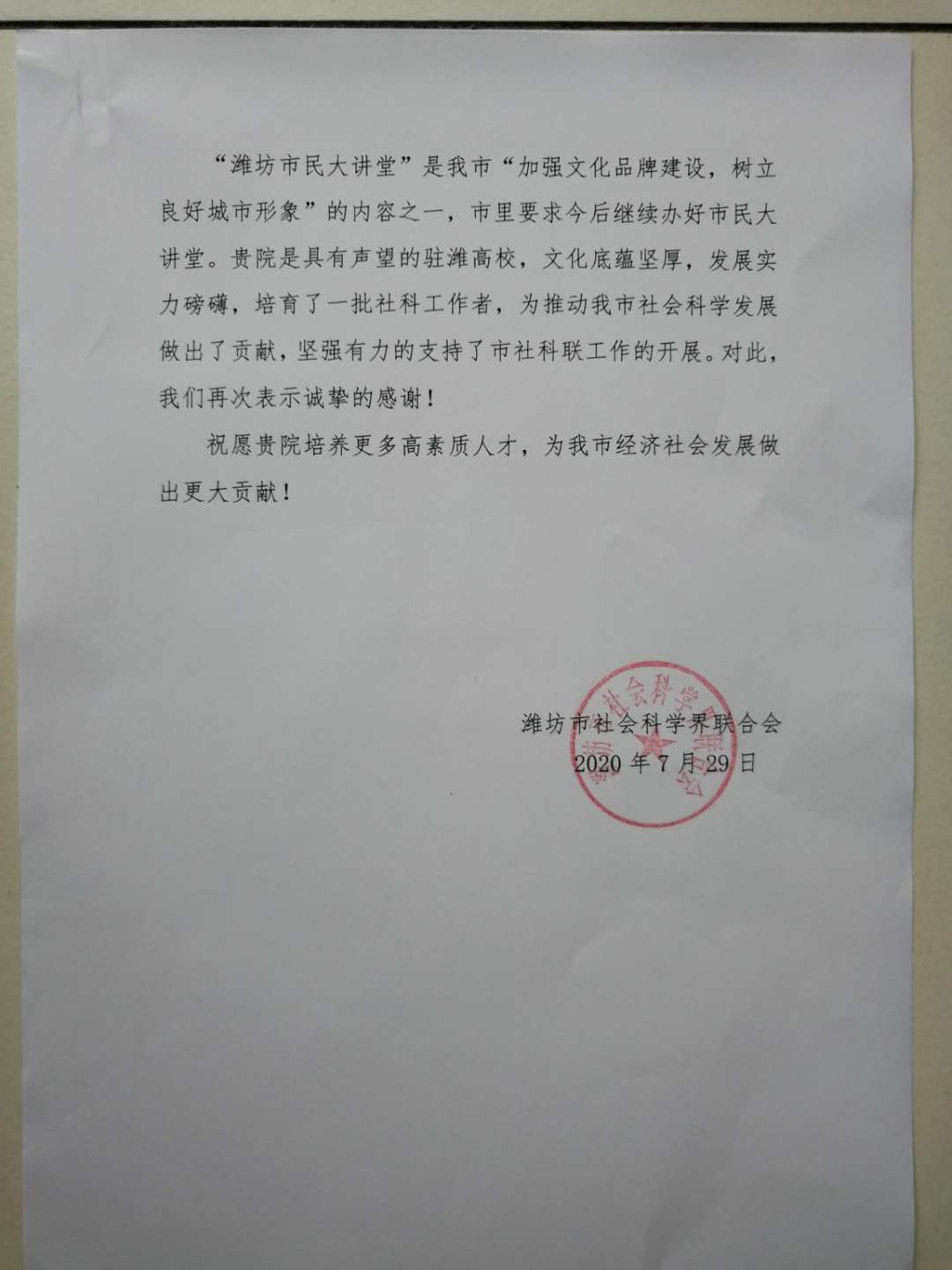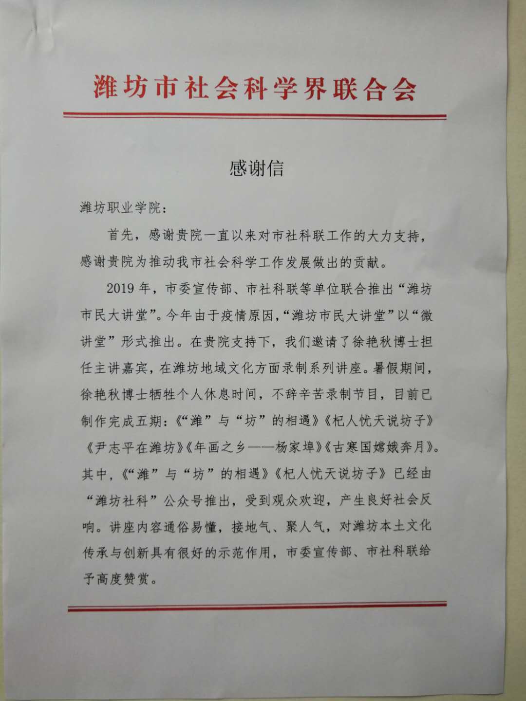 近日,学院收到潍坊市社会科学界联合会发来的感谢信,信中对beat365对市社科联工作的大力支持表示感谢,并对beat365徐艳秋博士参加“潍坊市民大讲堂”活动给予高度赞赏。