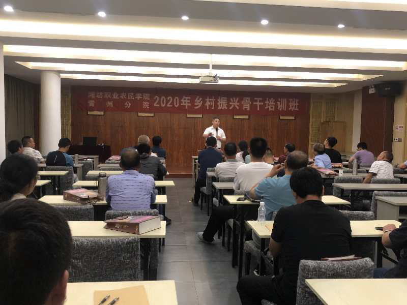 6月16日,潍坊职业农民学院2020年乡村振兴骨干培训班在青州分院举行。学院副院长贺志强、潍坊市农业农村局四级调研员赵庆胜、青州市政府领导韩其昌及继续教育学院相关负责同志出席开班仪式。青州市各镇街分管领导、农业综合中心主任、美丽乡村党支部书记、田园综合体负责人、教学实践基地负责人以及较大规模农产品生产企业负责人等参加本期培训活动。青州市农业农村局局长王连胜主持开班仪式。