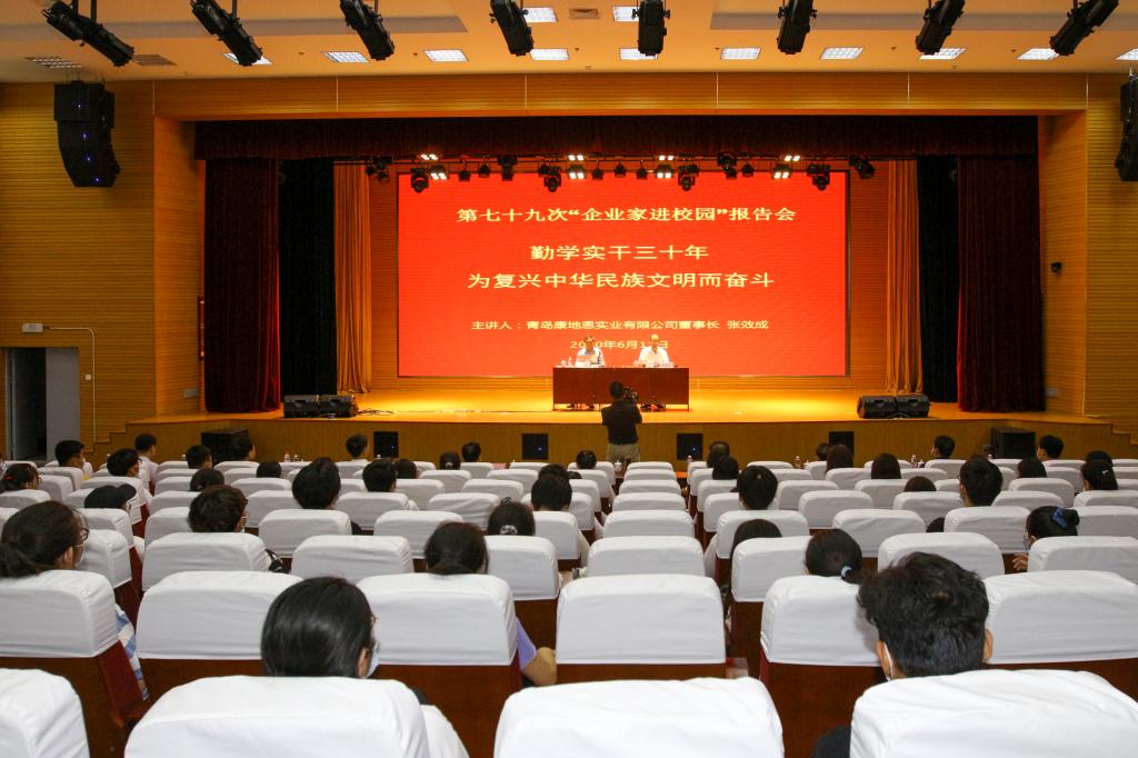 6月11日下午,学院第七十九次企业家进校园活动报告会在滨海校区图书馆报告厅举行。青岛康地恩实业有限公司董事长张效成作了题为“勤学实干三十年,为复兴中华民族文明而奋斗”的报告。学院党委书记马跃启、副院长贺志强、纪委书记郭晓辉出席报告会,农林科技学院、食品药品学院、化学工程学院党总支书记及分管校企合作的副院长和教师代表、科技处(产学研合作中心)相关同志及200名在校生聆听了报告会。