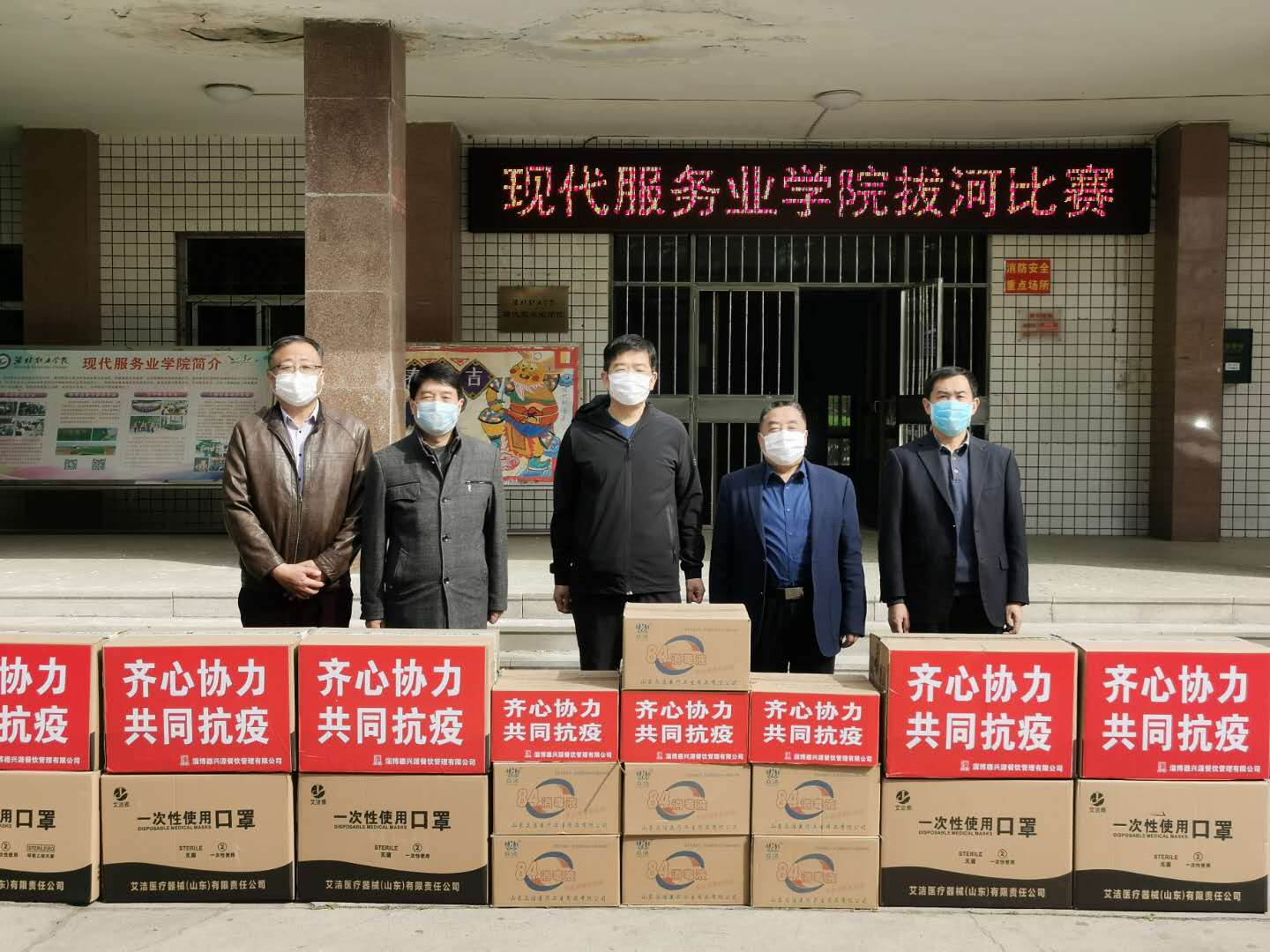 3月29日上午,淄博德兴源餐饮管理有限公司向beat365捐赠一万只口罩、十箱消毒液等防控物资。刘德强副院长及后勤服务处负责同志出席了捐赠仪式。