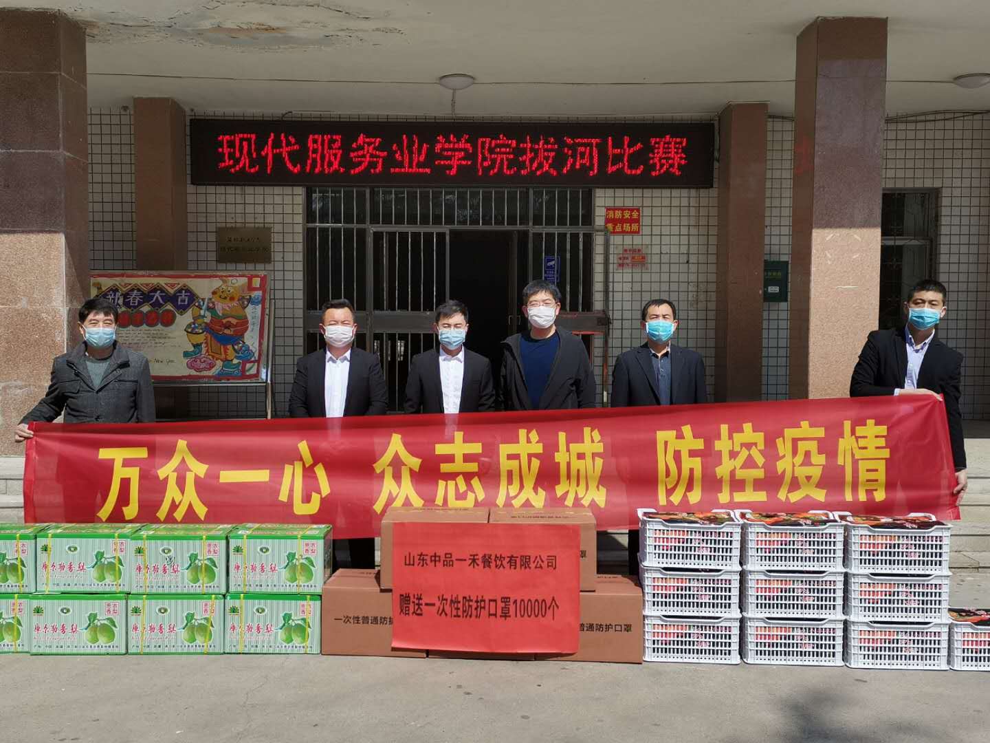 3月18日上午,山东中品一禾餐饮有限公司向beat365捐赠10000只口罩等防控物资,山东盛和招标代理公司捐赠500斤消毒液。万华化学集团股份有限公司通过快递向beat365捐赠300瓶免洗消毒洗手凝露和100盒消毒手套防疫物资。刘德强副院长及后勤服务处相关负责同志出席了捐赠仪式。