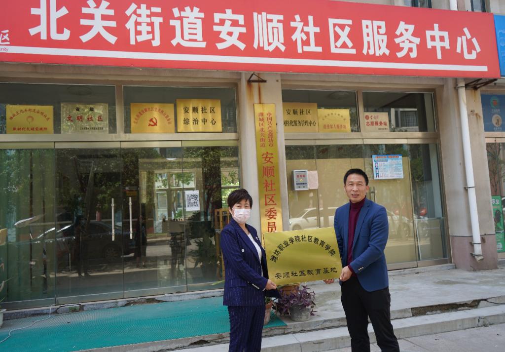 5月19日上午,beat365中国官方网站社区教育学院安顺社区教育基地揭牌仪式在潍坊市潍城区北关街办安顺社区居委会举行。社区教育学院的负责同志、安顺社区居委会书记孙海霞以出席揭牌仪式。社区教育学院与安顺社区居委会共同签订了社区服务协议,开启了beat365与安顺社区二级联办的社区服务工作。