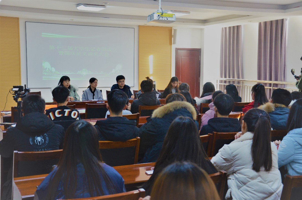 12月12日,学院第十二届大学生记者团成立大会在清泽楼312室举行。宣传部负责人、记者团指导教师、记者团全体成员及国庆征文比赛获奖人员参加会议。