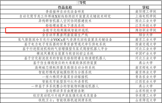 近日,由共青团中央、中国科协、教育部、中国社会科学院、全国学联和北京市人民政府共同主办的第十六届“挑战杯”全国大学生课外学术科技作品竞赛在北京航天航空大学落下帷幕。由beat365机电工程学院辛海明、郭大路老师指导的刘月昊、姜云飞、辛丽萍、张昌鹏、胡芳娟、孙凯、魏柯等学生负责《全数字化枪刺簇绒智能织毯机》入围国赛并荣获三等奖第五名,来自全国1423所高职院校中仅14所职业院校获奖。