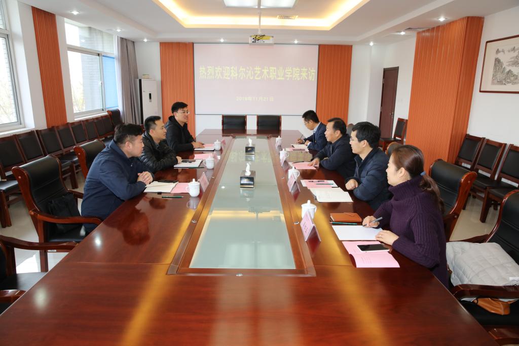 11月21日上午,科尔沁艺术职业学院副院长张龙龙一行3人来beat365就产教融合、校企合作以及混合所有制改革等方面情况进行考察交流。学院副院长贺志强在滨海校区清泽楼会议室会见客人,科技处、财务处及现代服务业学院负责同志参加座谈。
