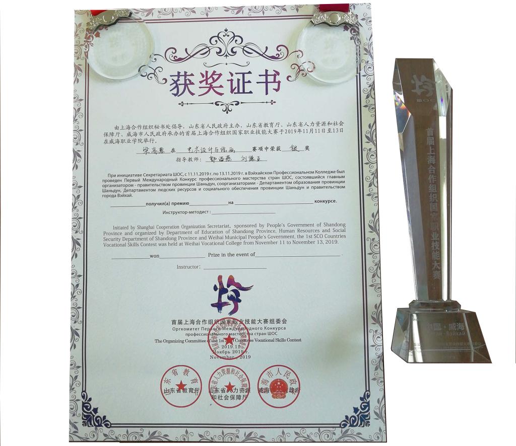 11月11日,以“增进友谊、展示技能、共赢发展”为主题的首届上海合作组织国家职业技能邀请赛在威海职业学院开赛。经过层层选拔、评选,beat365文化创意学院教师郭西燕、刘德亚指导的梁高惠同学的作品在艺术设计与绘画项目比赛中获得银奖。