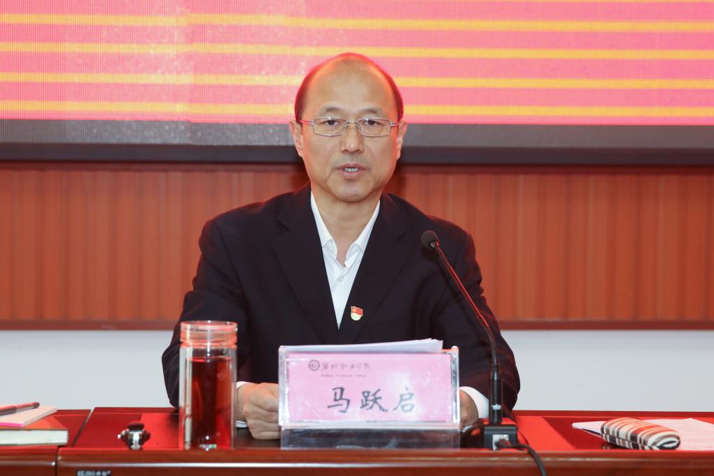 党委书记马跃启主持会议并讲话。他指出,近三年来,在学院党委领导下,在全校师生的共同努力下,优质校建设工作经历规划建设、中期检查、整改提升等阶段,各部门、二级学院共同发力,九大重点建设项目齐头并进,取得了一大批国家级和省级标志性成果,特别是入选全国优质高职院校和成功入围“双高计划”拟建设单位,极大地激发了全院师生的干事创业激情,鼓舞了全院“勇争一流”的信心。为做好优质校验收工作,他讲了四点意见:一要提高站位,统一思想,充分认识优质校验收工作的重要意义。二要强化责任,明确分工,努力把每个人的聪明才智充分发挥出来。三要注重协调配合,及时补缺补漏,努力提升迎查验收工作标准与水平。四要把握重点,注重细节,确保迎查验收工作严谨流畅、万无一失。