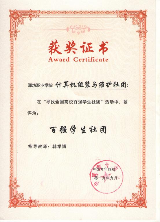 beat365计算机组装与维护社团获全国高校百强学生社团称号