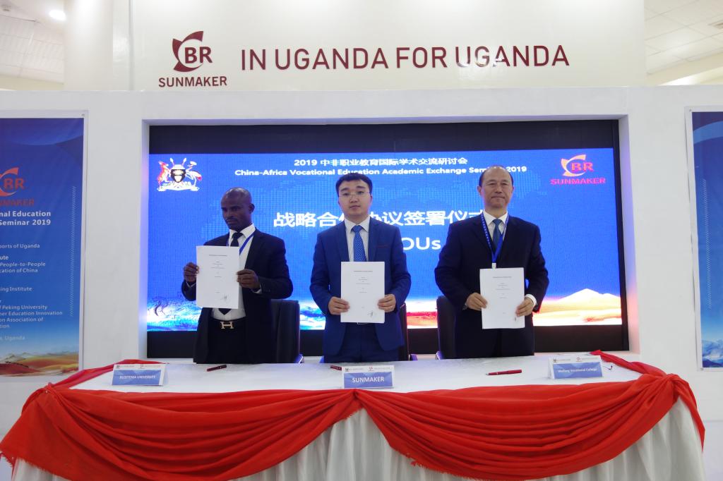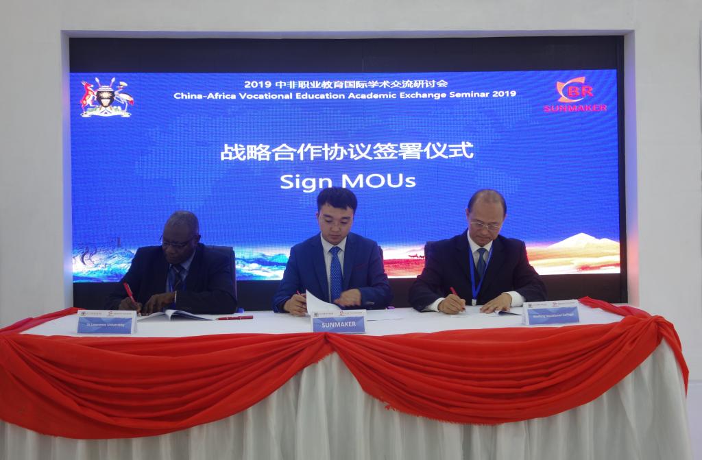 在乌干达,代表团参加了在首都坎帕拉举办的“2019中非职业教育学术交流研讨会”,来自中国、埃塞俄比亚、肯尼亚、坦桑尼亚、乌干达等国家的教育主管部门、职业院校等百余名专家学者与会,讨论中非职业教育合作前景,为中非交流合作搭建平台。马跃启作为中方职业院校代表在研讨会上发言,介绍了中国职业教育概况和beat365中国官方网站的办学实践经验,并签署《坎帕拉倡议》。之后,代表团参加了中非职业院校国际合作交流对接洽谈会和小组专题研讨会,就如何落实“一带一路”和中非合作论坛框架内的教育领域合作,拓宽中非技能培训合作规模展开研讨和项目洽谈,与乌干达贝茨特玛大学、布和巴技术学院和圣劳伦斯大学分别签署合作协议,与圣西门彼得职业培训中心达成合作意向,重点在校际间的师资培训、学生交流、农业技术培训和农机维修等方面开展合作。本次研讨会,乌干达高等教育国务部长穆因戈和中国驻乌干达大使馆政务参赞陈会新分别致辞,乌干达国家电视台、中国职业教育网、人民网、CGTN分别进行跟踪报道。