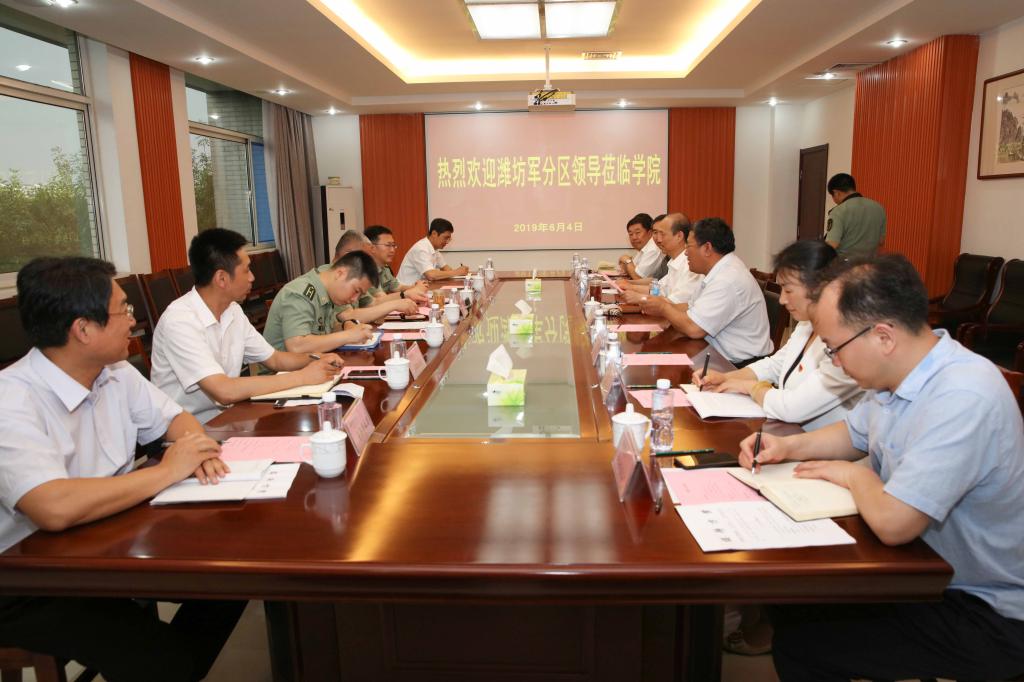 6月4日,潍坊军分区司令员丁峰来beat365调研大学生征兵工作。学院党委书记马跃启、院长王家爱、党委副书记宋桂言,滨海区党工委副书记李树森,寒亭区武装部部长刘罡、学院武装部主要负责同志等陪同调研和座谈。