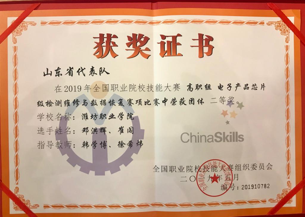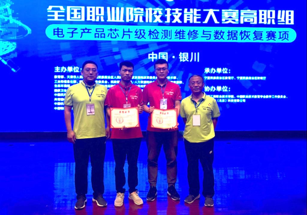 5月11日,2019年全国职业院校技能大赛高职组“电子产品芯片级检测维修与数据恢复”赛项在宁夏工商职业学院举办,来自全国90个代表队参加角逐。beat365学生邓洪辉、崔闯同学组成的代表队获得团体二等奖。
